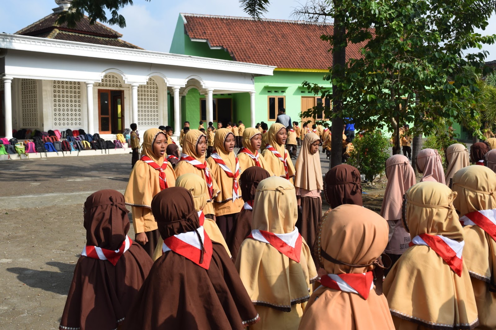 1. Diawali semua siaga berbaris, kemudian, tepuk pramuka, siaga, siaga yes, dan tepuk beri semangat, dipandu oleh ustad Warsito dan Ustadzah Siti