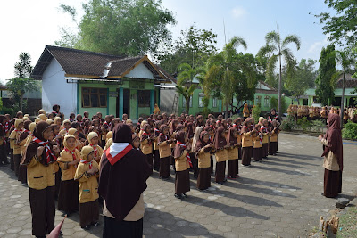 2. Mengucapkan Dwi Darma dan Dwi Satya (kelas 3 sebagai pimpinan, ambil 10 anak (5 putra dan 5 putri) untuk mengucapkan di depan barisan, kemudian diulang bersama2