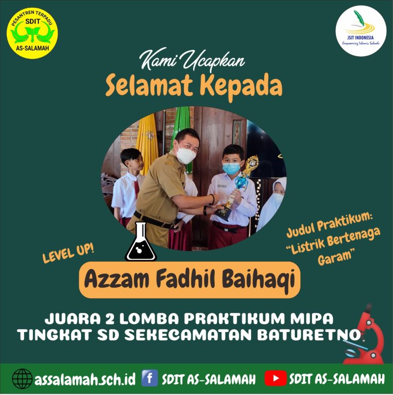 Alhamdulilah Pada Senin, (23/05/2022) telah diumumkan bahwa santri kita Azzam Fadhil Baihaqi telah berhasil meraih juara 2 lomba praktikum MIPA tingkat SD Se-Kecamatan Baturetno.
